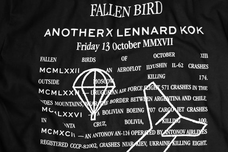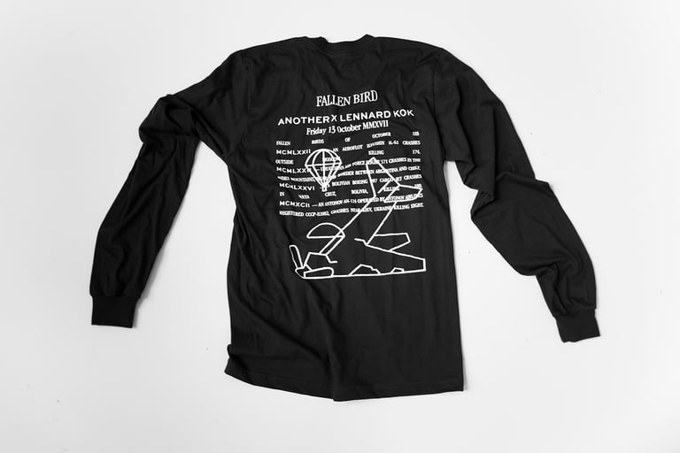 A black long sleeve shirt with screen print on the back created for the official launch of 'Fallen Bird' on Friday 13th of October 2017. The shirt lists all known major passenger planes which have crashed on October 13.